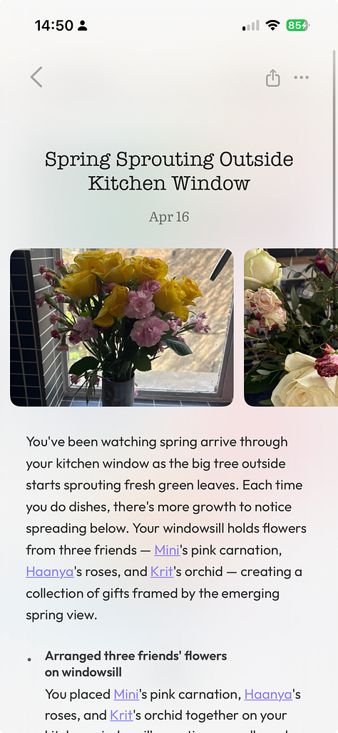 Earlier today, my heart down Russell Sq, beat to the music, the foliage, the vitamin d, sprinting next to a friend who smiles with the prettiest eyes. My windowsill is in full bloom: flowers from Mini, Haanya, and Krit. Living is an addiction: the wall still echoes laughter from Mason’s wicked jokes, and the kitchen still smells of Hanna's buttery dough. On the stage that night, Lenker's voice erupts like a volcano: Real love is double infinity. A mysterious power: my budding feeling, ready to give again, promise I won’t monkey with it this time.