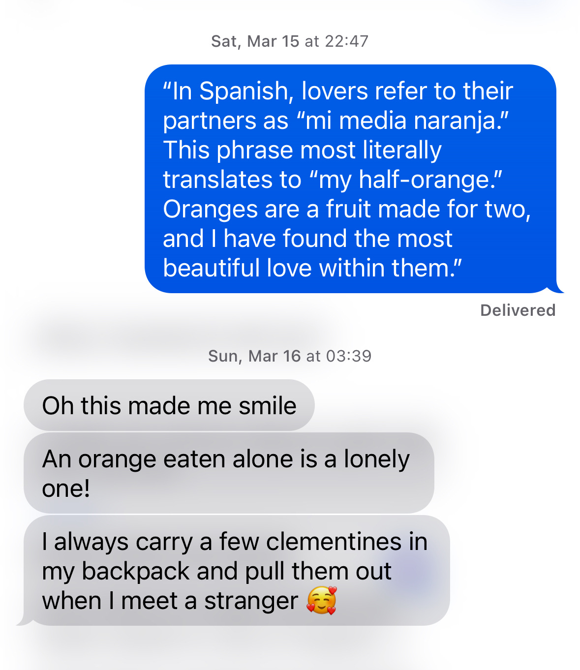 This is how I think about friendships: to take the best things of my life, split them into pieces and petals like an orange, and hand them to people I love. Take the bigger piece, because there is more than enough. 🧡