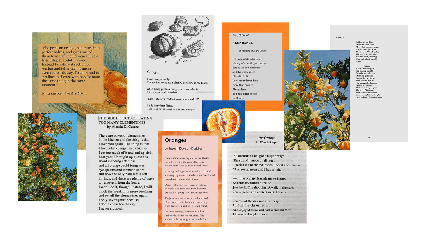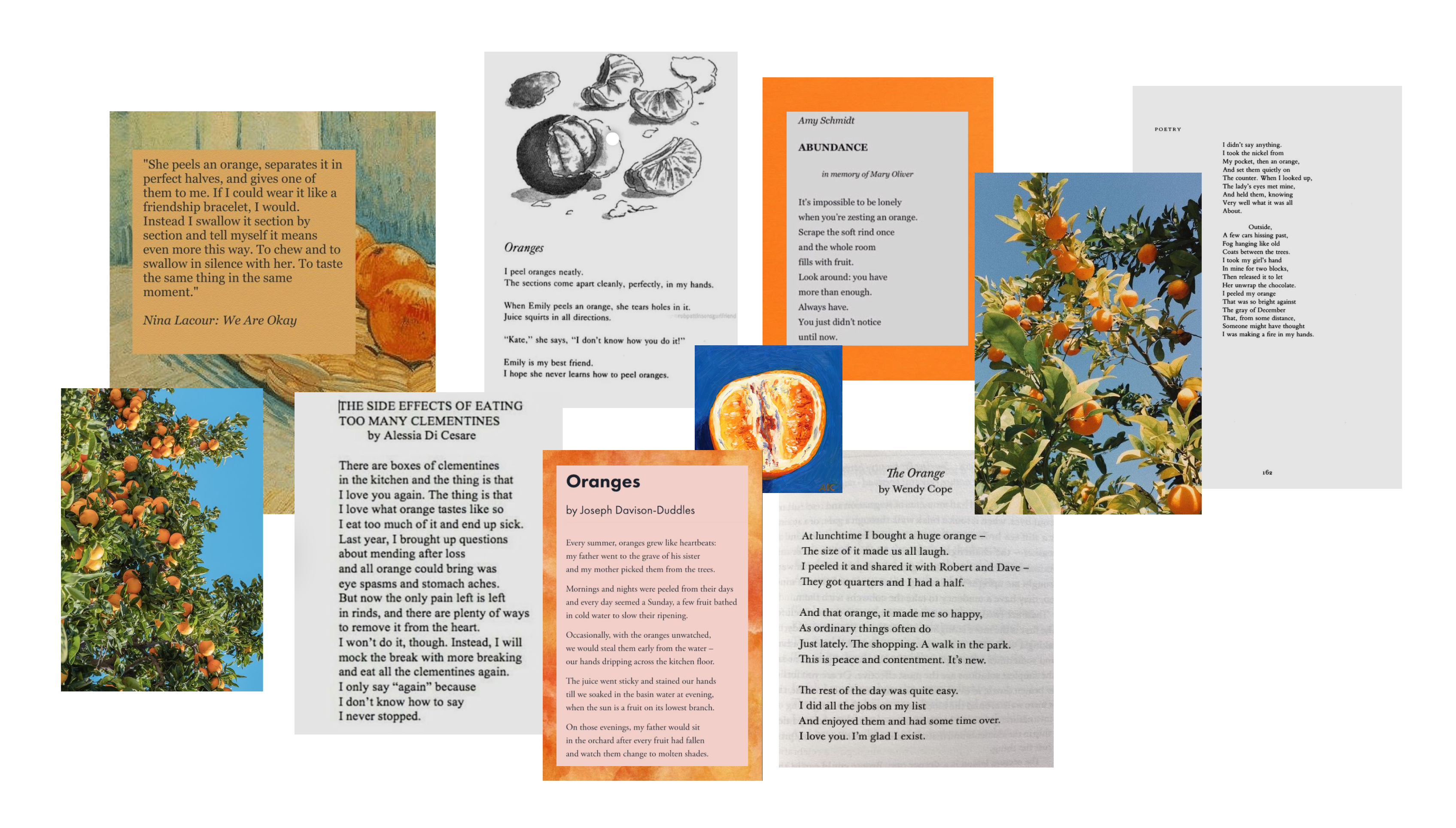 Salma and I are so enamored with oranges that we compiled a collection of poems about them. I can't think of a better metaphor for friendships. An orange is not meant to be eaten alone. If it were, natural selection would have sculpted it one big blob for one to sink teeth in; yet inside its translucent membrane, each petal is perfectly intact, destined to be shared.